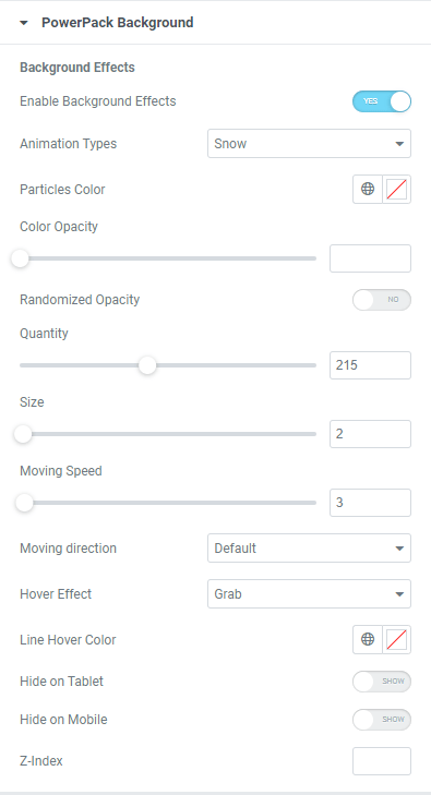 Nachdem das Plugin installiert und aktiviert wurde, findet sich in den Abschnittsoptionen der Punkt „Powerpack Background“. Darüber kann der Hintergrund-Effekt aktiviert werden: