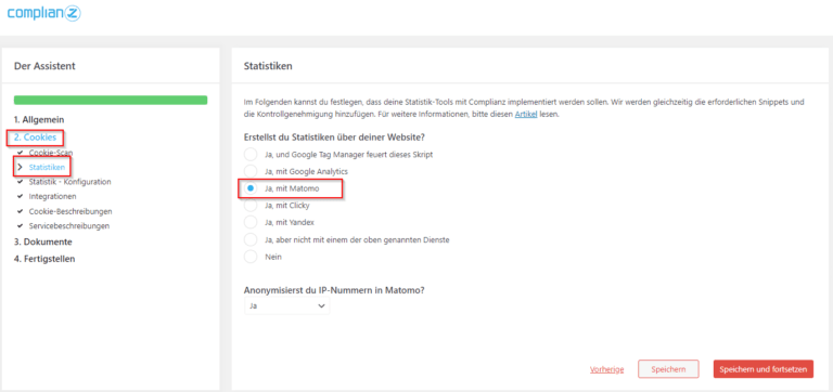 An der Stelle, an der Complianz nach dem Einsatz nach Statistik-Plugins fragt, musst du den Haken bei „Ja, mit Matomo“ setzen: