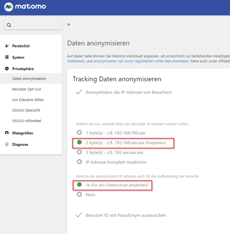 Ebenso empfehle ich die Matomo-Datenschutzeinstellungen wie folgt zu hinterlegen: