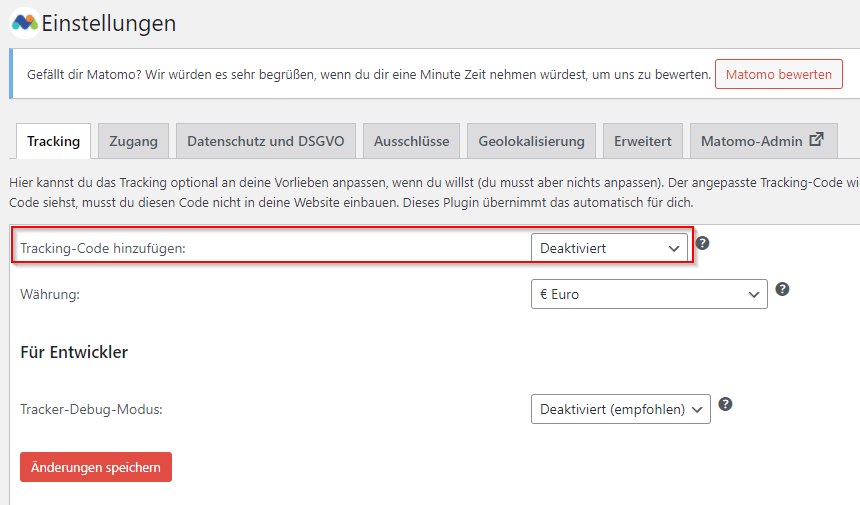 In den Plugin-Einstellungen solltest du das integrierte Tracking deaktivieren, da ansonsten immer aufgezeichnet wird:
