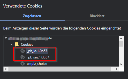 Klicke anschließend auf „Cookies“. Wird dir dort ein Cookie mit „_pk*“ angezeigt, hat Matomo den Aufruf registriert: