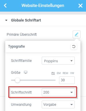 Anbei ein Beispiel, wie in Elementor (auch in der kostenlosen Version) der Schriftschnitt global (also für die komplette Website) für Überschriften, Haupttext, etc. eingestellt werden: